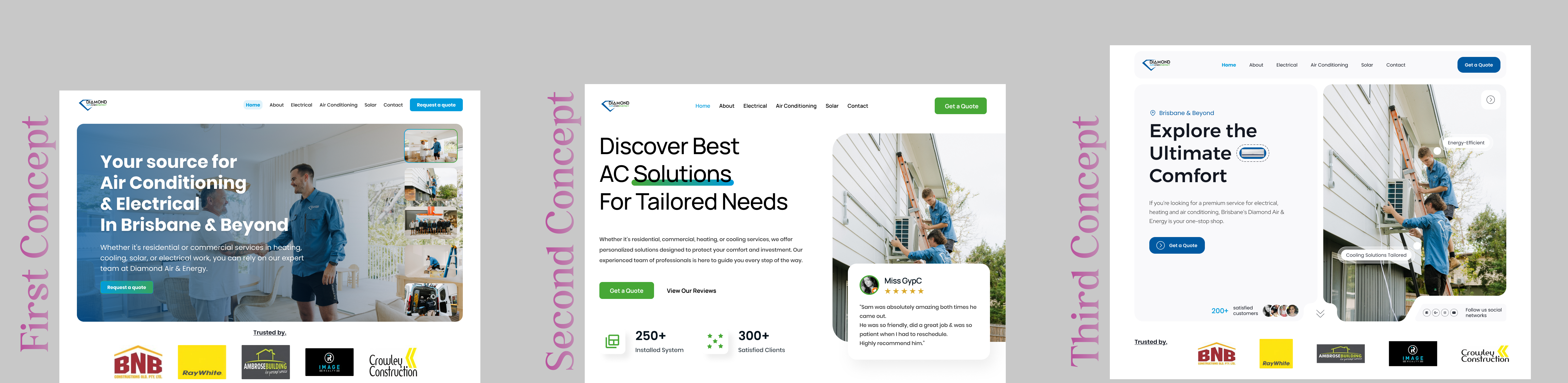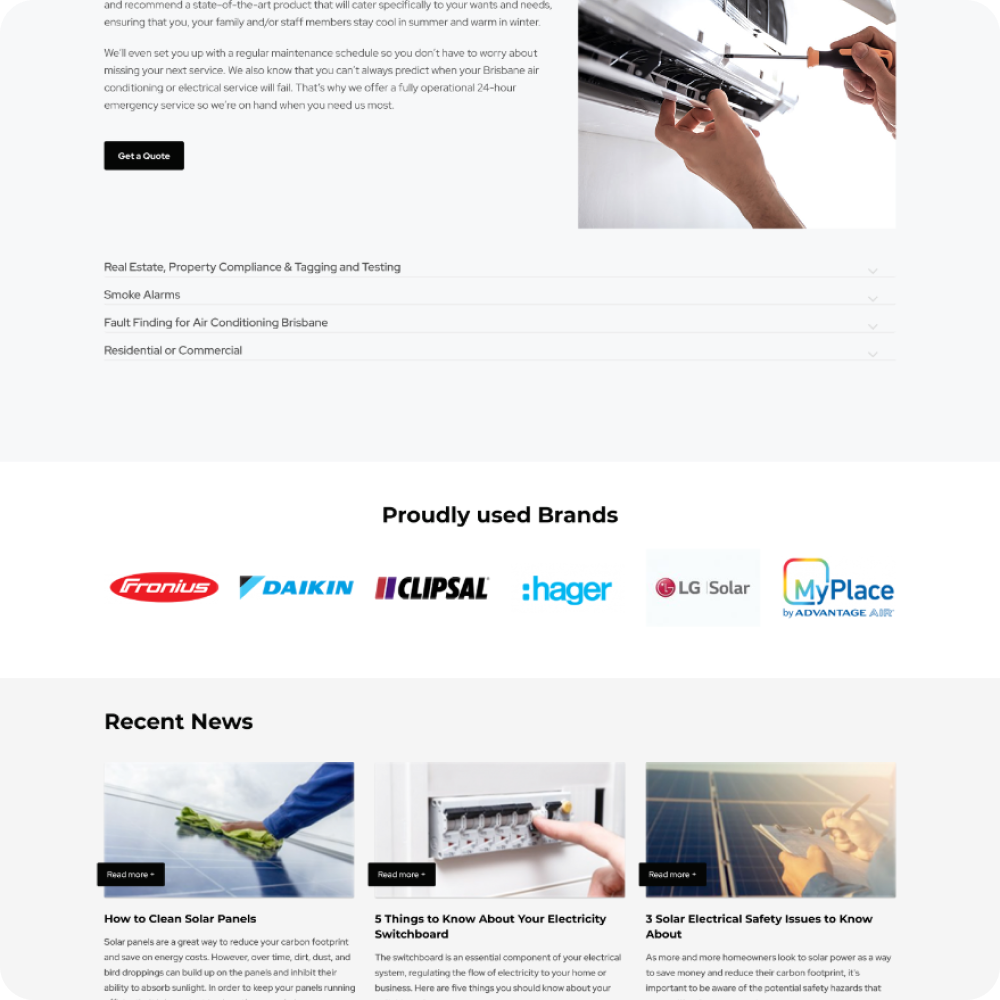 After client selected their preferred direction, we designed and developed the complete landing page including service sections (air conditioning & heating, electrical & emergency, solar, property compliance), partner showcase (Ambrose Building, BNB Construction, Ray White, Image Realty, Crowley Construction), brand partners (Daikin, Fronius, Clipsal, Hager, LG Solar), and consultation booking forms.
