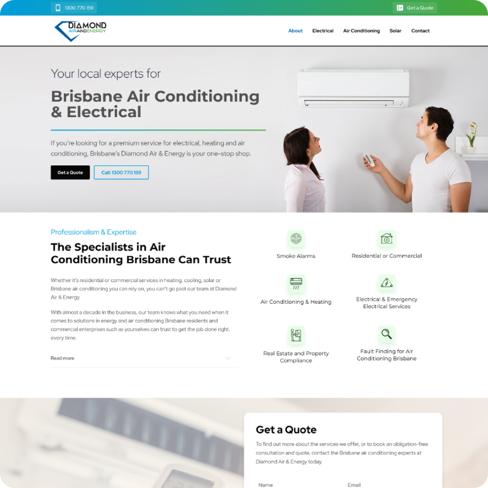 With almost a decade serving Brisbane with air conditioning, electrical, and solar services, Diamond Air & Energy had built strong partnerships with companies like Ray White, Ambrose Building, and BNB Construction. However, their website didn't reflect their professionalism or showcase their premium service offering. They needed a modern digital presence that matched their quality workmanship.